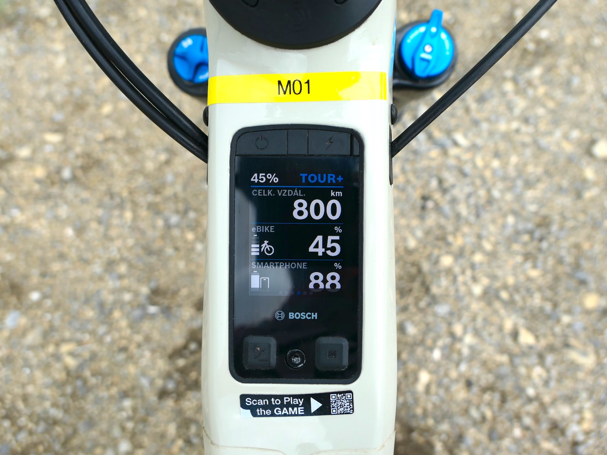 – Režim Tour+: priemerná rýchlosť 21,3 km/h, priemerný výkon 245 W, priemerná kadencia 89 ot./min – 30 km / 700 m prevýšenia = úbytok len 38 % batérie