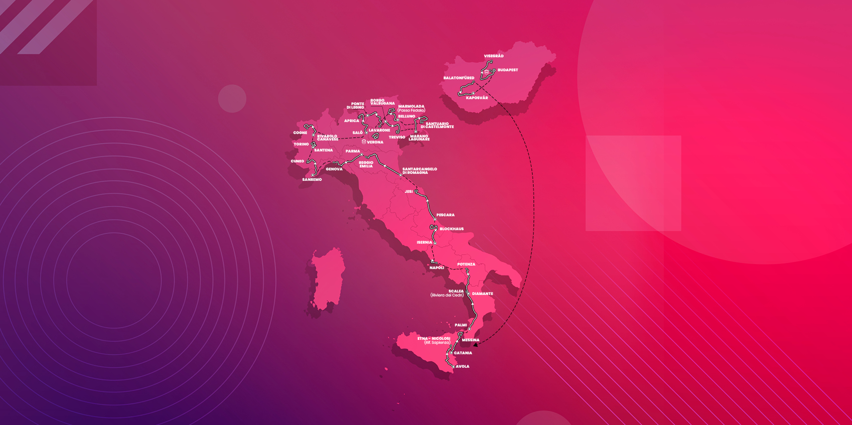 Prvý tohtoročný Grand Tour štartuje 6. 5. 2022 trochu netradične v Budapešti. Grande Partenza mala v Maďarsku prebehnúť už pred dvoma rokmi. Kvôli čovidu si ale maďarskí fanúšikovia museli počkať. Po troch etapách sa jazdci presunú už späť na talianske územie a zo Sicílie si to namieria na sever do talianskych Álp.