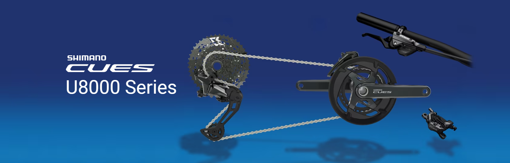 Najvyšší rad Cues U8000 s 11-rýchlostnou kazetou – nástupca sady Deore – dostal prémiovú povrchovú úpravu. Kovový lesk "osemtisícovky" dodáva bicyklom na atraktivite. Kľuky v prevedení Hollowtech majú jednoprevodník so 40 a 42 zubami, alebo dvojprevodník (46/36). Kazeta má rozsah 11-45, prípadne je možné použiť aj kazetu 11-50.