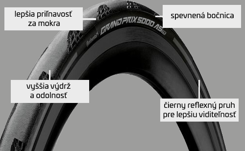 Plášť Continental Grand Prix 5000 AllSeason TR špeciálne navrhnutý tak, aby fungoval v náročných podmienkach celoročne a poskytol jazdcovi väčšiu istotu, ktorú potrebuje na prejdenie veľkej porcie kilometrov. S počiatočnou hmotnosťou iba 250 g pre šírku 25 mm je plášť Grand Prix 5000 AS TR veľmi ľahký, napriek tomu poskytuje výnimočnú odolnosť a výdrž.