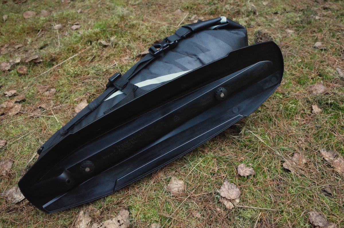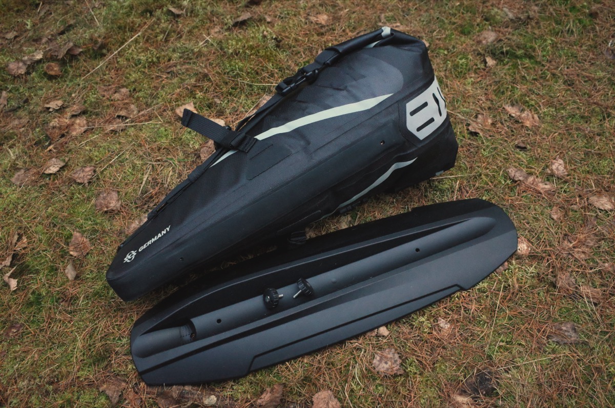 EXPLORER EXP. FRAMEBAG, na prvý pohľad niečo medzi celorámovou a polovičnou rámovou taškou. Jej dĺžka 43,5 cm a výška 23,5 cm dávajú nádej, že pri väčších veľkostiach rámov zostane priestor na košík na fľašu.