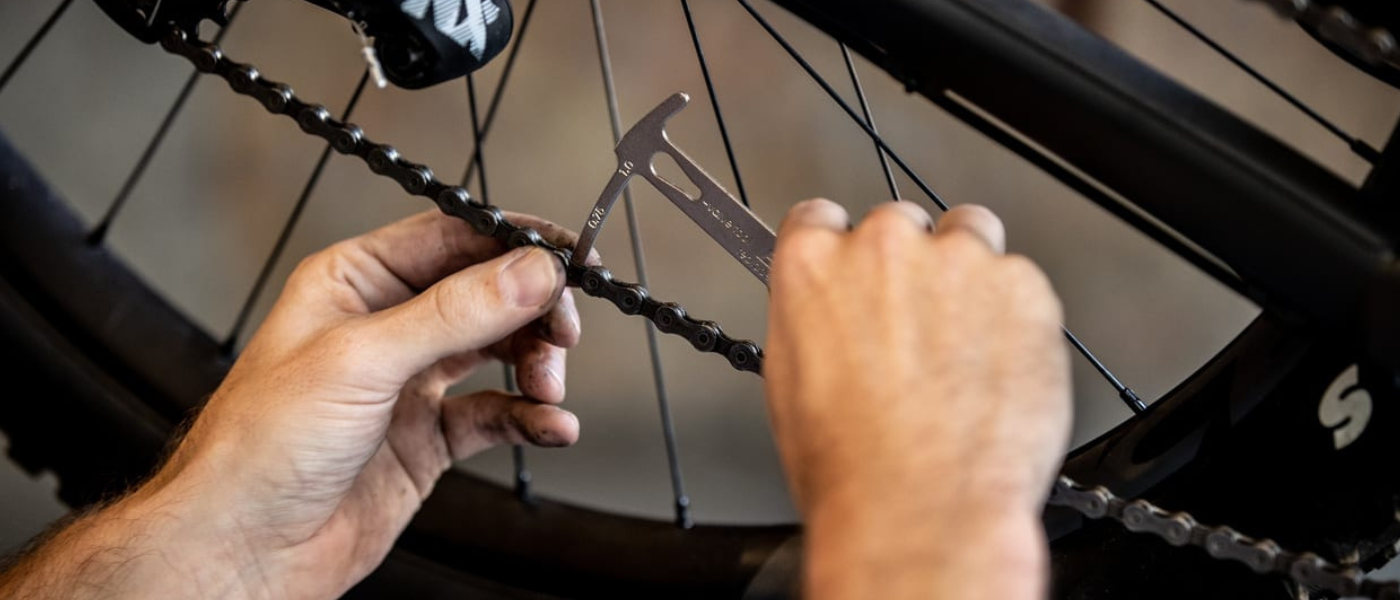 - Použite mierku na reťaz (chain checker): pri hodnote 0,75 % je čas na výmenu (vždy merajte podľa návodu, mimo spojky reťaze).