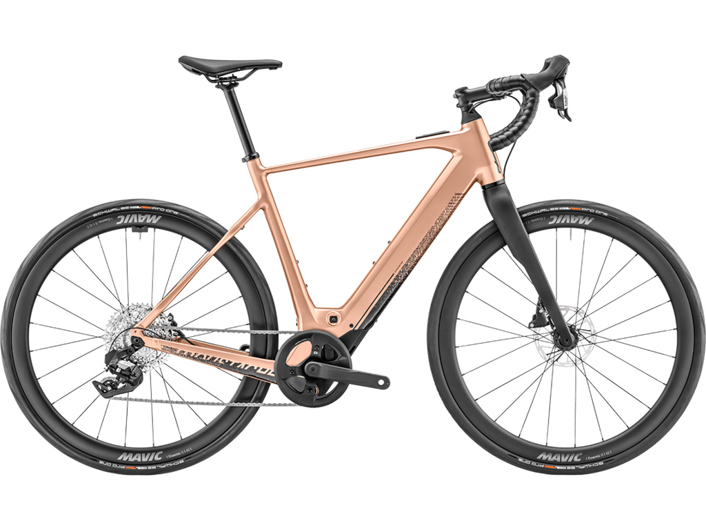 Model Samedi Dimanche 28.6 v exkluzívnej farbe Light Copper predstavuje to najlepšie, čo značka Moustache ponúka pre športovú cestnú jazdu s elektrickou podporou. Je postavený na pevnom a zároveň ľahkom ráme z hliníka, doplnenom karbónovou vidlicou a prémiovým karbónovým wheelsetom Mavic Cosmic S42 – všetko pre maximálnu efektivitu a ovládateľnosť.