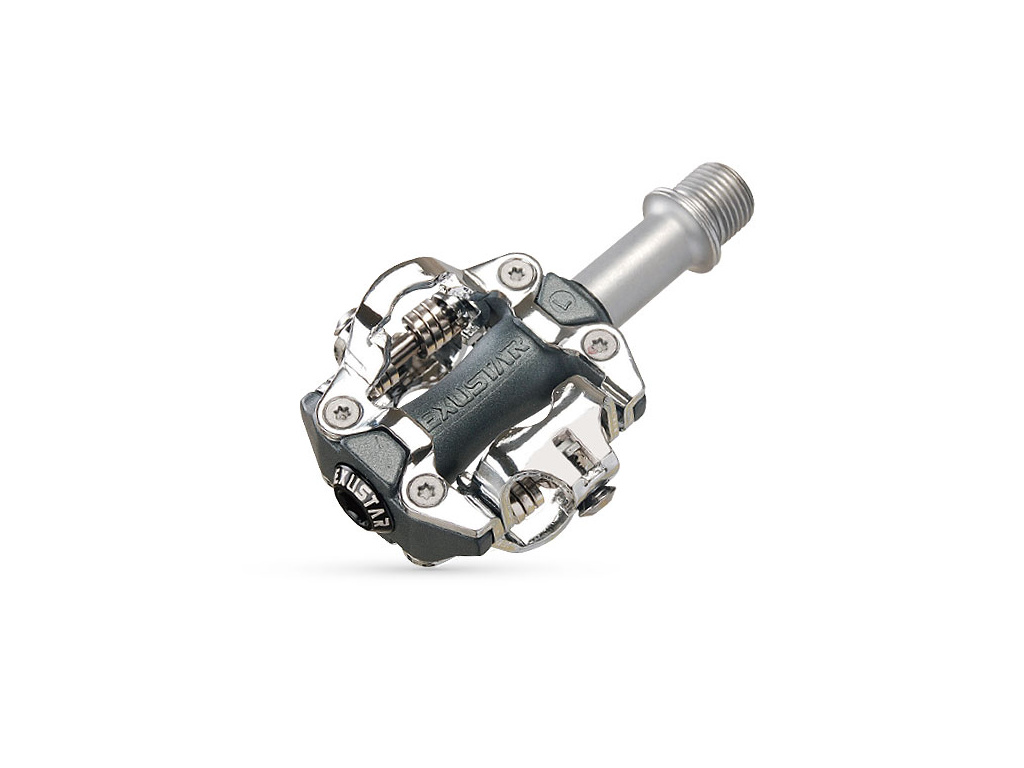 Ľahké pedále Exustar PM213 v striebornej farbe s vynikajúcim pomerom cena/hmotnosť/kvalita. Kompatibilné so štandardným systémom SPD.