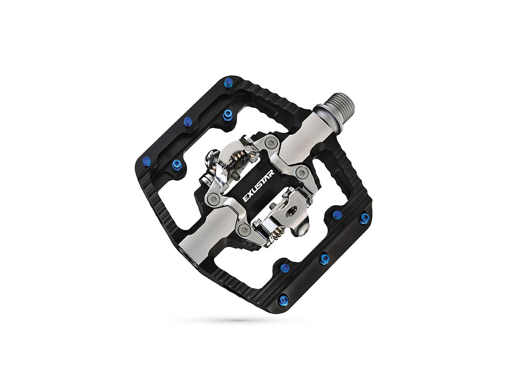 Na bezpečnejšiu jazdu v teréne si zaobstarajte nízkoprofilové MTB pedále Exustar E-PM823 s hliníkovou platformou s protišmykovými eloxovanými pinmi. Telo pedálu je vyrobené z lisovaného hliníka, CNC obrábaná CrMo os a systém dvojitých ložísk LSL.