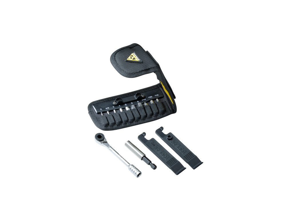 15-funkčný veľmi kompaktný ľahký Multiklíč s jemnou prepínateľnou račňou z chróm-vanádiovej ocele a ďalšími 10 nástrojmi z tvrdenej ocele (1/4" bit) v prenosnom púzdre: