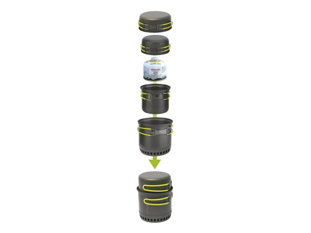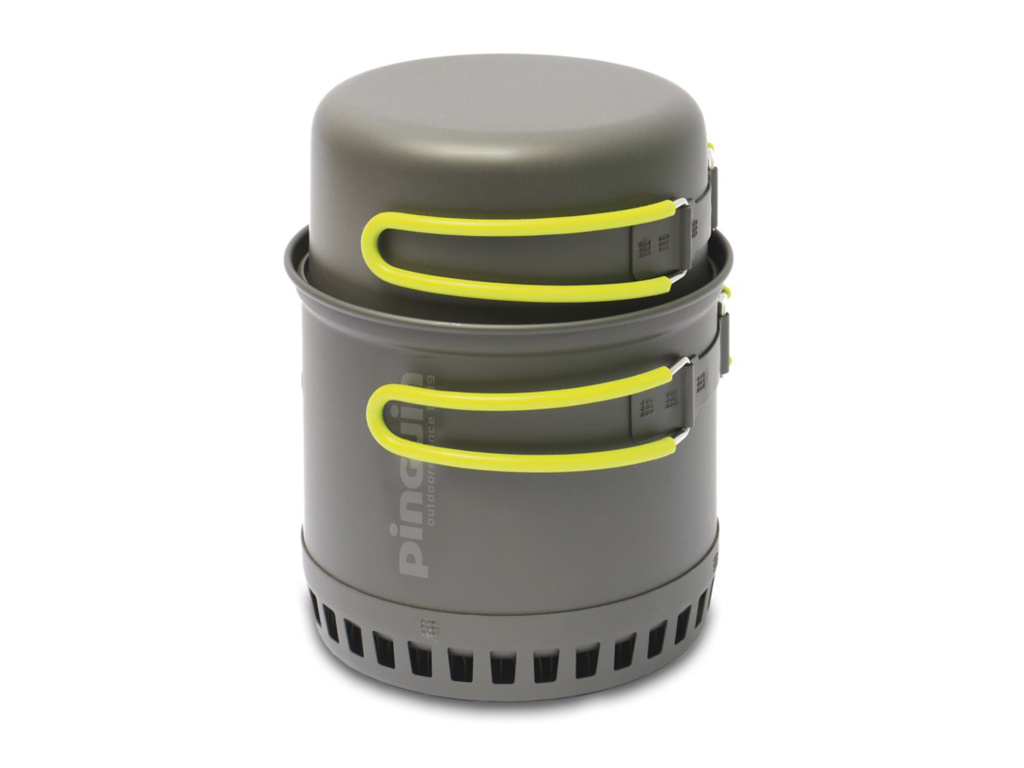 Súprava riadu s výmenníkom tepla pre dve osoby.Dva hrnce s dvoma hlbokými miskami, z ktorých väčšia je vybavená výmenníkom tepla, vyrobené z hliníka s eloxovaným povrchom. Skladacie rukoväte sú vyrobené z oceľového drôtu, opatreného silikónovým žiaruvzdorným rebrovaním.Eloxovanie (tiež Eloxation) vytvára na povrchu materiálu veľmi silnú a tvrdú vrstvu oxidu hlinitého, ktorá zabraňuje ďalšej oxidácii, zvyšuje pevnosť materiálu a jeho odolnosť voči oderu.Výmenník tepla zachytáva teplo produkované varičom, ktoré by inak "obchádzalo" hrniec, čím sa ušetrí až 30 % paliva.Obsah balenia:Hrniec, pokrievka, hrniec, pokrievka