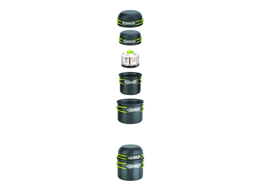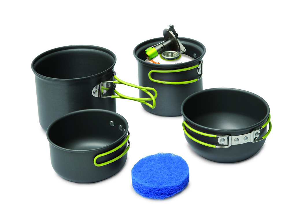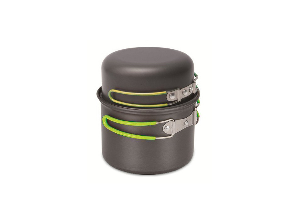 Súprava kempingového náčinia pre dve osobySúprava dvoch hrncov s dvoma hlbokými pokrievkami z hliníka s eloxovaným povrchom. Skladacie rukoväte sú vyrobené z oceľového drôtu so silikónovým rebrovaním odolným voči teplu.Eloxovanie (tiež Eloxing) vytvára na povrchu materiálu veľmi silnú a tvrdú vrstvu oxidu hlinitého, ktorá zabraňuje ďalšej oxidácii, zvyšuje pevnosť materiálu a jeho odolnosť voči oderu.Balenie obsahuje:Hrniec, pokrievka, hrniec, pokrievka