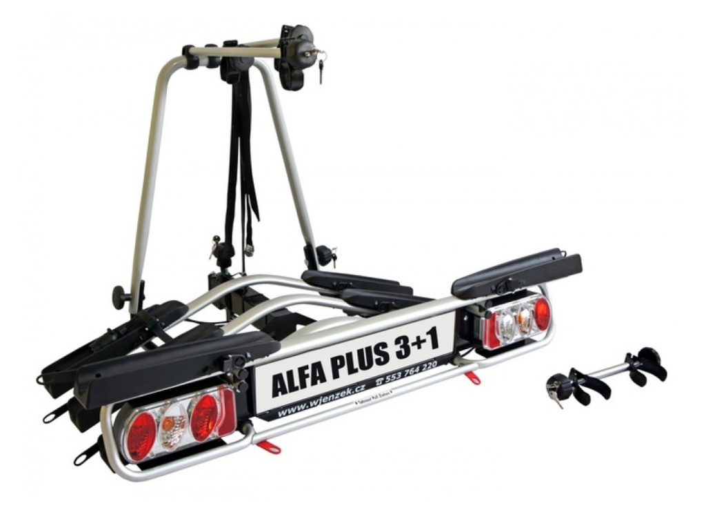 Nosič bicyklov na ťažné zariadenie Alfa Plus 3 1 je určený na prepravu 4 bicyklov. Nosič je vybavený funkciou skladania, ktorá umožňuje prístup do batožinového priestoru aj s naloženými bicyklami. Umožňuje uzamknutie nosiča k vozidlu a uzamknutie bic