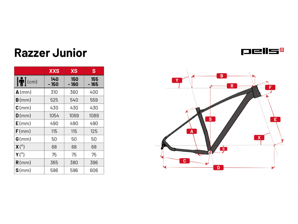 Razzer Comp Junior predstavuje to najlepšie z radu juniorských bicyklov Pells. Rám s modernou geometriou XC ponúka vynikajúcu tuhosť pre minimálne straty energie pri zachovaní nízkej hmotnosti. V kombinácii s 27,5" kolesami je bicykel obratný a rýchly. Razzer Comp Junior je vybavený vzduchovou vidlicou SR Suntour XCR 32 100 mm, prevodovkou Shimano Deore 1x10 s kazetou 11-42, výkonnými brzdami Shimano BR-MT201 a plášťami Continental Race King Shieldwall.#RIDETOEXPLORE