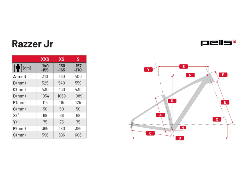 Model PELLS Razzer Junior ponúka skvelú kombináciu výbavy na každodenné použitie. Rám s modernou geometriou ponúka výbornú tuhosť pre minimálne straty energie a zároveň zachováva nízku hmotnosť. Bicykel tak v kombinácii s 27,5“ kolesami skvele prekonáva prekážky, je agilný a rýchly. Model je osadený kvalitnou výbavou v podobe odpruženej vidlice SR Suntour XCM 100 mm, pohonu TBA 1x9, výkonných bŕzd Shimano BL-MT200 a plášťov Continental Cross King.