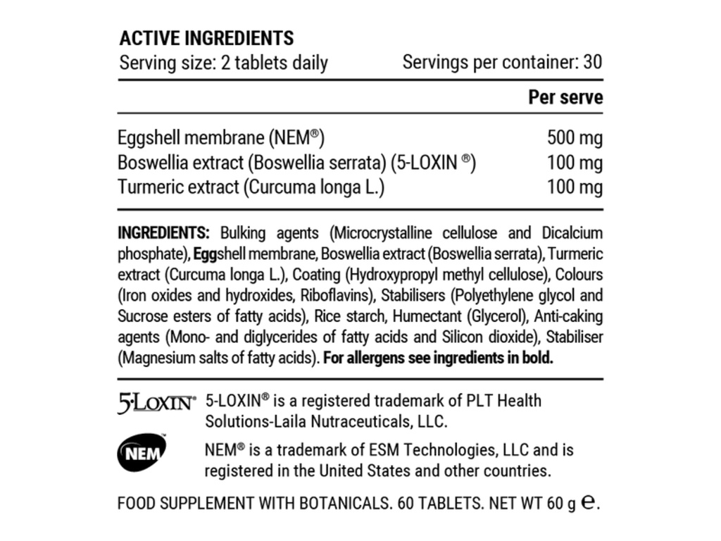 Prvý kĺbový prípravok na trhu určený na ochranu kĺbov športovcov. Kombinácia patentovaných zložiek NEM®, 5-LOXIN® a kurkumínu podporuje zdravie kĺbových chrupaviek a pohyblivosť kĺbov. Zloženie zároveň zmierňuje zápal, bolesť a stuhnutosť kĺbov.