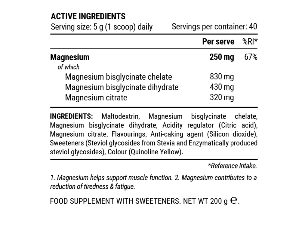 Ide o formu horčíka naviazanú na aminokyselinu glycín. Glycín pôsobí synergicky s neurotransmitermi ako GABA a pomáha zlepšovať vstrebávanie a upokojenie nervového systému.