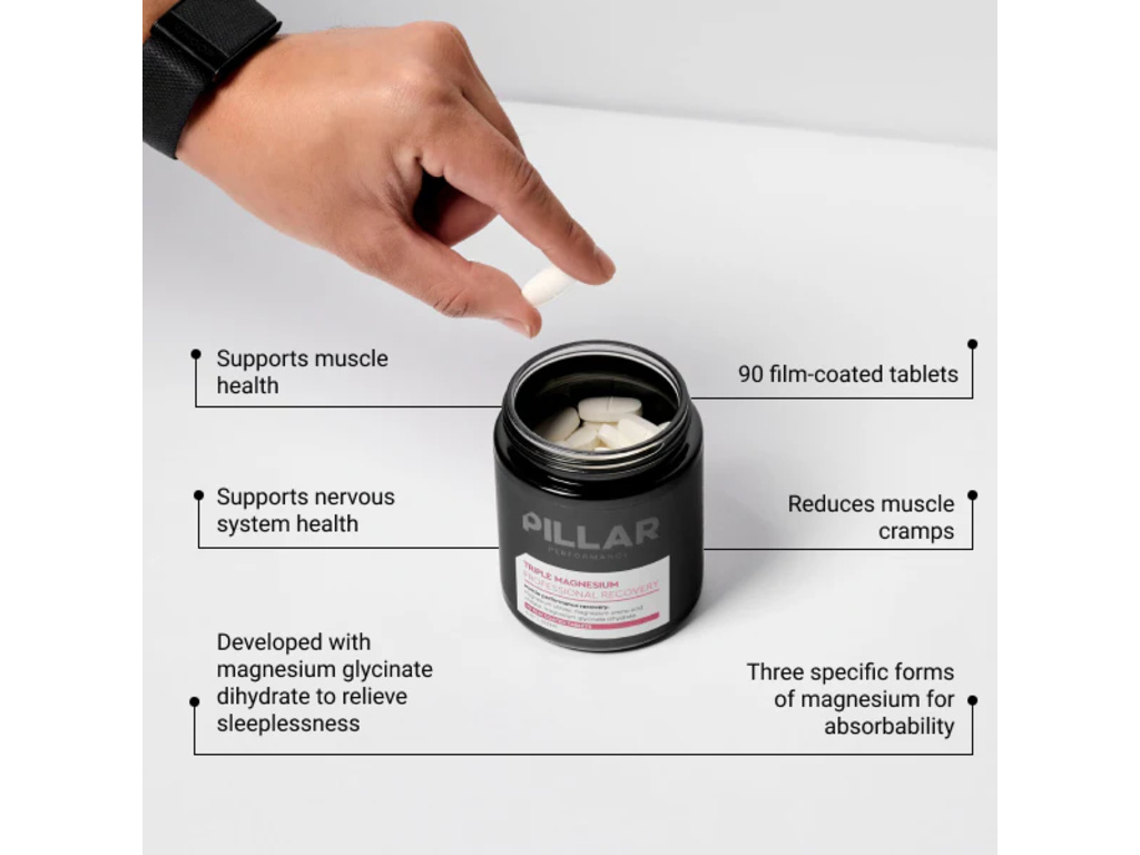 PILLAR Triple Magnesium obsahuje tri vybrané formy vysoko vstrebateľného horčíka vrátane TRAACS® od Albion Minerals. Tieto formy spoločne poskytujú viacúčelovú podporu pre zlepšenie spánku, regenerácie a pomoc pri kŕčoch.