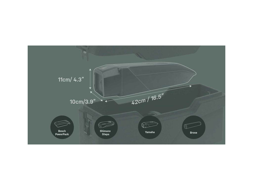 • kompatibilný s batériami Bosch 300 / 400 /500 WH, Shimano Steps E8000 418 / 540 / 630, Yamaha 400 / 500 WH, Brose 630 WH, resp. s batériami s max.rozmermi 42 x 10 x 11 cm