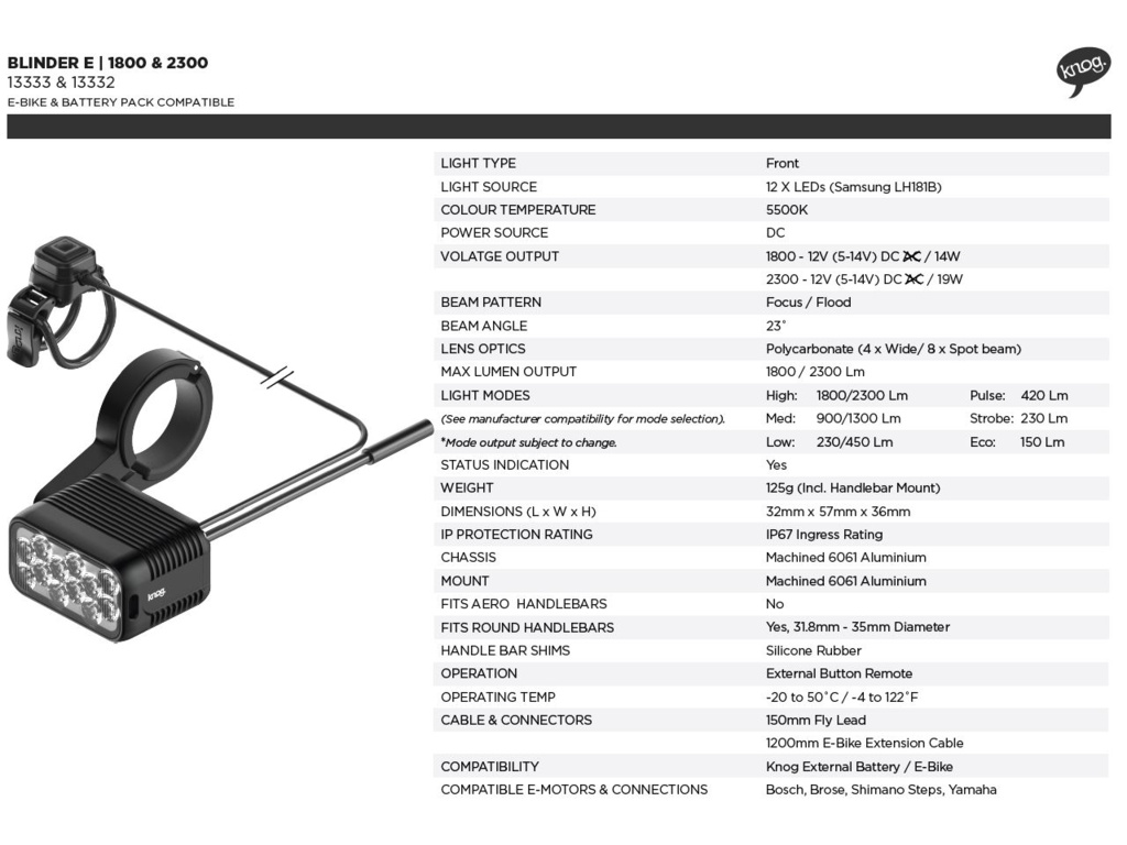 Nové svetelné hlavice Blinder E od značky KNOG sú napájané z batérie elektrobicykla. Obsahujú kabeláž, ktorú je potrebné spojiť so správnym konektorom daného výrobcu elektrobicyklov.