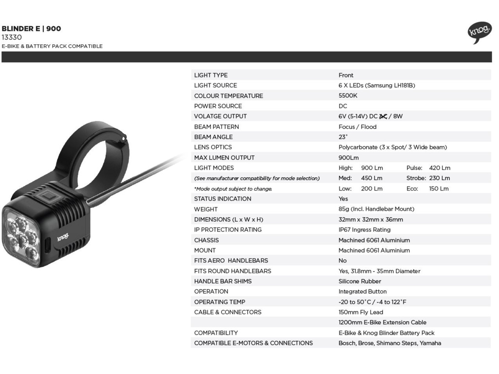 Nové svetelné hlavice Blinder E od značky KNOG sú napájané z batérie elektrobicykla. Balenie obsahuje aj kabeláž, ktorú je potrebné prepojiť s motorom elektrobicykla daného výrobcu elektrobicyklov.