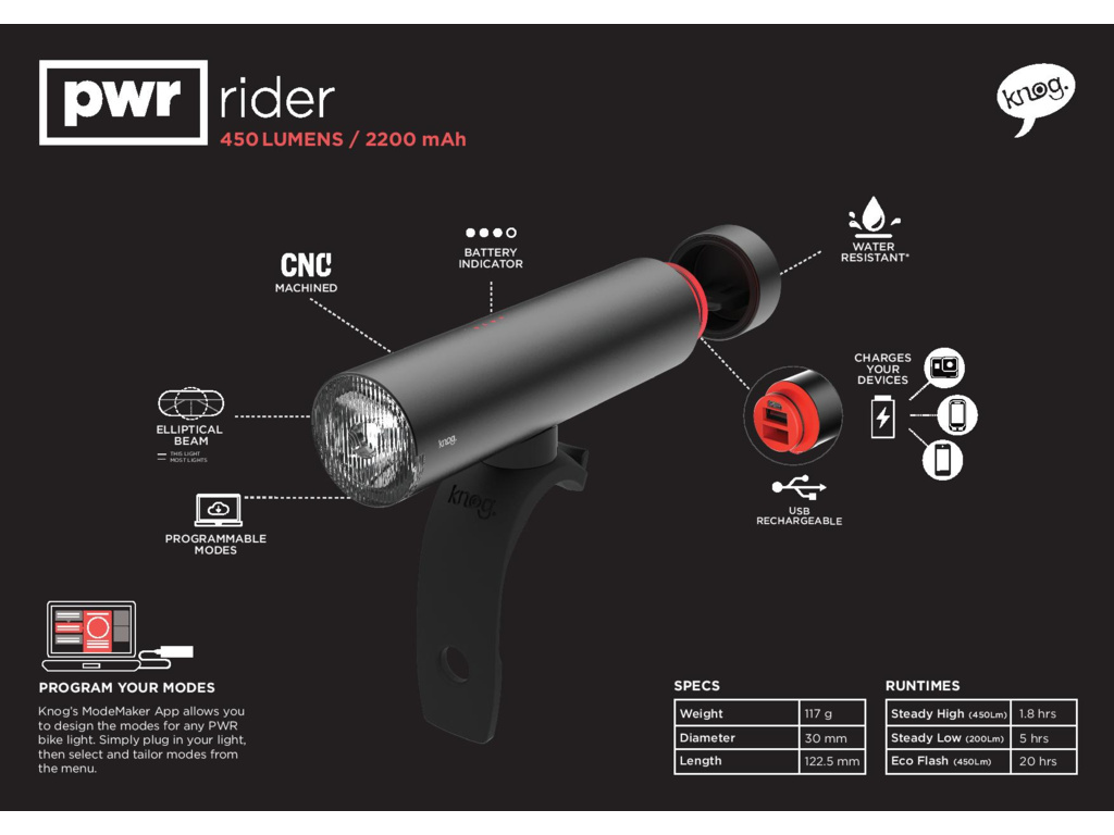 KNOG PWR Rider je cyklistické svetlo s eliptickým kužeľom svetla a integrovanou powerbankou, vďaka ktorej môžete nabíjať ďalšie zariadenia, ako napr. mobilný telefón, smart hodinky, GoPro a ďalšie. Disponuje výkonom 450 lúmenov / 2200mAh a má 6 programovateľných režimov. Je vodoodolné a praktické vďaka indikátoru stavu batérie. Má pohodlný silikónový držiak a súčasťou balenia sú 2x USB káble a imbusový kľúč.