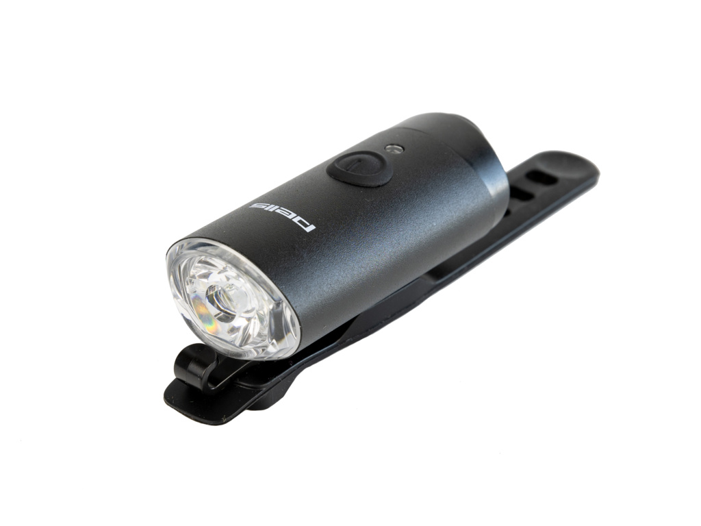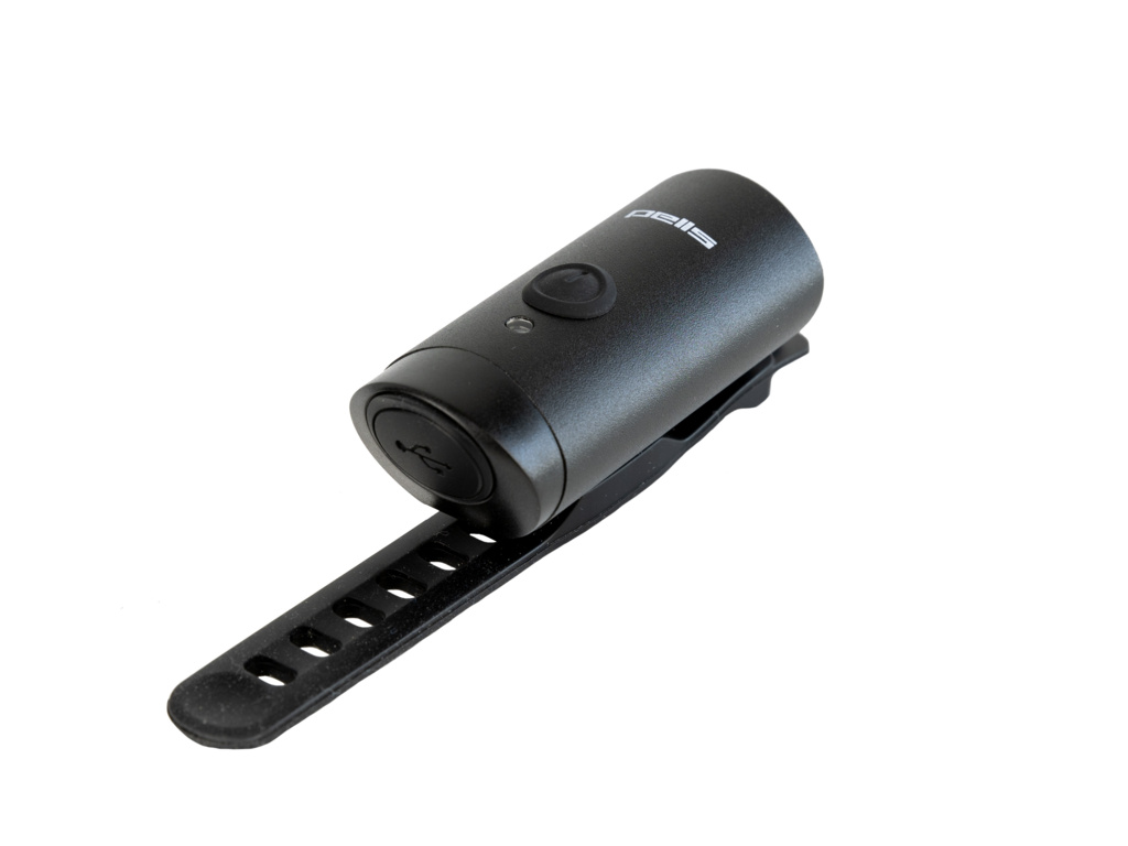 Predné svetlo PELLS Helio 500 lumenov má vodotesné kovové telo, gumový pásik na pripevnenie, päť režimov svietenia a