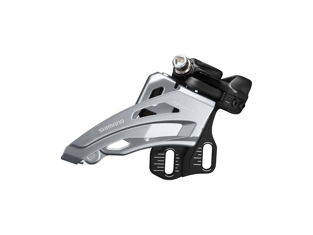 Prešmykač Shimano FD-MT400 s upevnením typu E, pre 2x9 prevodov a bočné ťahanie.