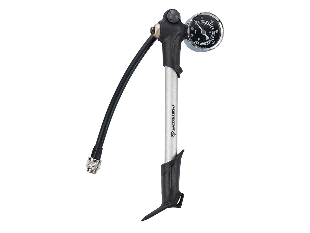 Pumpa na tlmiče MERIDA SHOCK je nevyhnutnosťou pre každého, kto má na svojom bicykli odpruženú vidlicu alebo zadné odpruženie. Funguje až do maximálneho tlaku 300 psi / 21 bar a je vyrobená z ľahkého hliníkového tela a plastovej rukoväte. Hadica bez poškriabania umožní, aby pumpovanie bolo hračkou a presný číselník zabezpečí, že budete vždy presne informovaní o aktuálnom tlaku. K jemnému doladeniu je k dispozícii tlačidlo na uvoľnenie vzduchu, ktoré uvoľní 3 psi / 0,2 baru na jeden stlač.