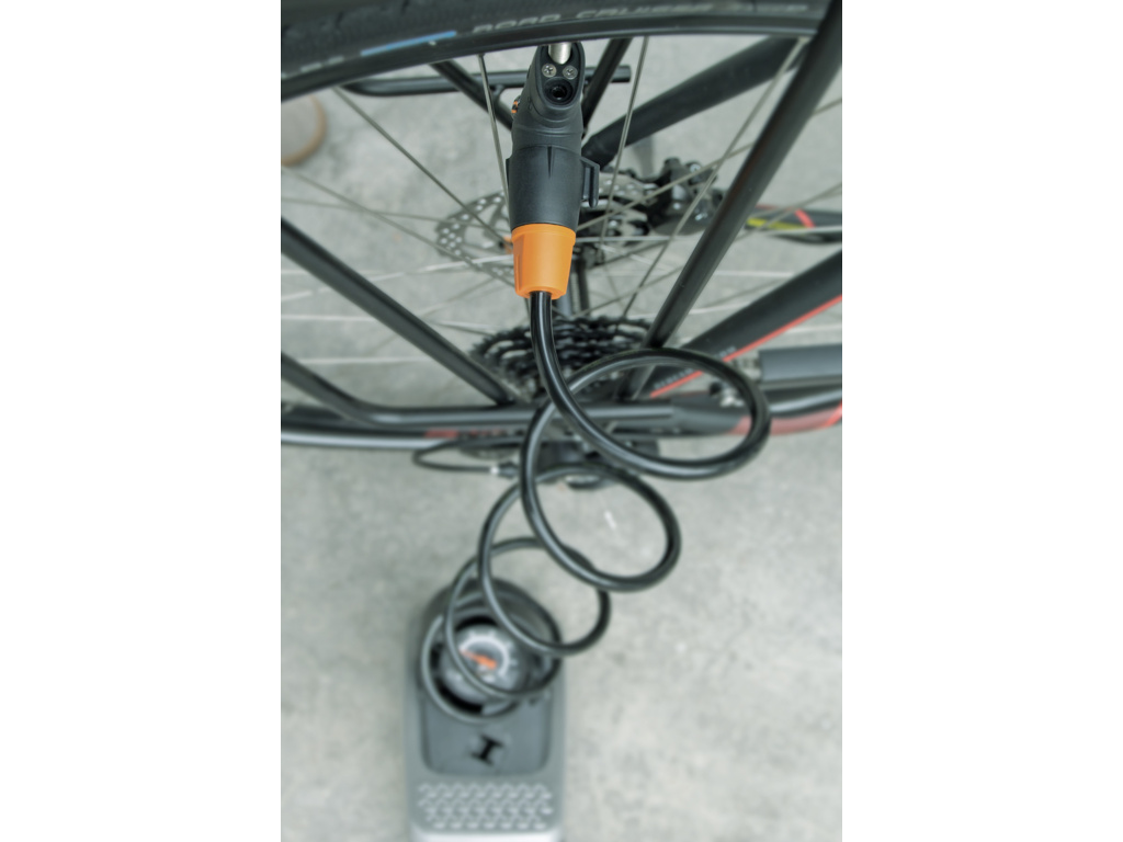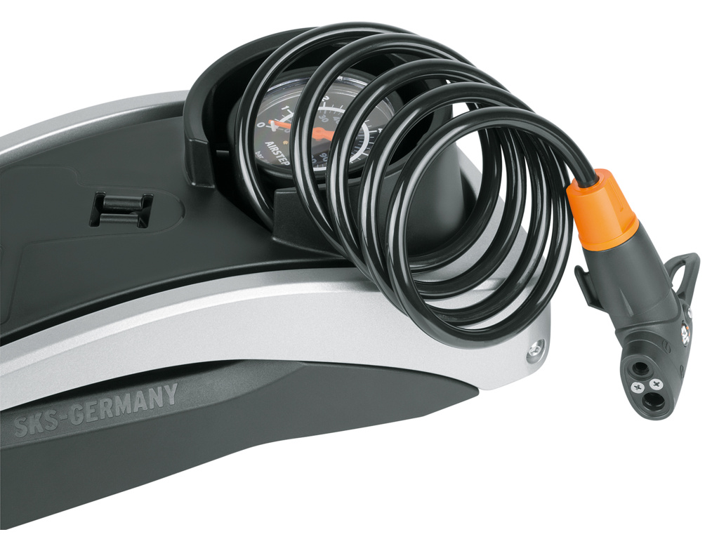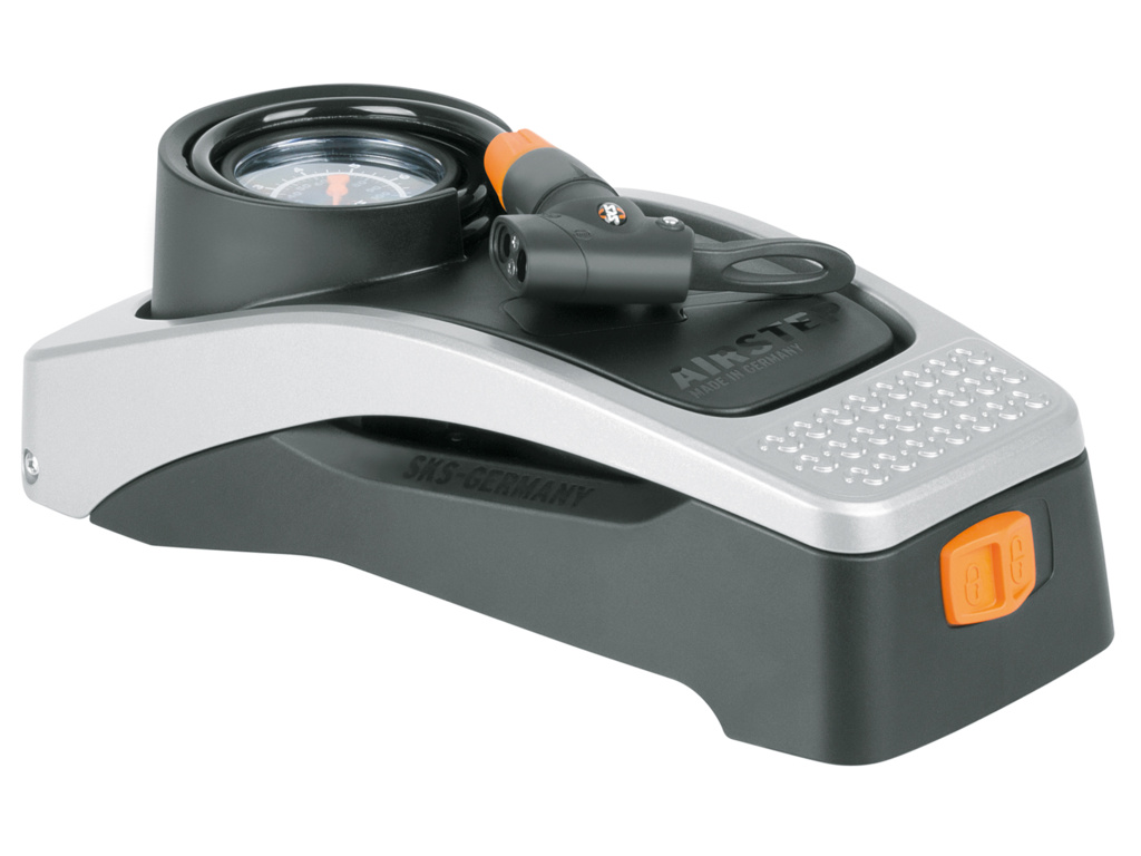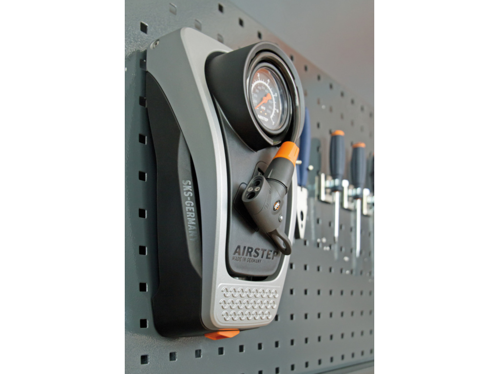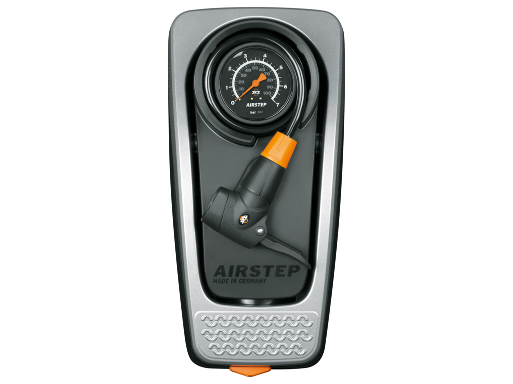 Nožná pumpa SKS Germany AirStep kombinuje vlastnosti klasickej pumpy a najnovšie technológie Made in Germany. Prvotriedny materiál najvyššej kvality, koncept konštrukcie a užívateľsky prívetivé funkcie (veľký manometer, integrovateľná špirálová hadica s ventilkovou hlavicou pre všetky druhy ventilčekov) dávajú pumpe úplne nový a inovatívny vzhľad. Ergonomický robustný hliníkový nožný pedál umožňuje maximálne možné natlakovanie 7 bar/102 PSI bez ťažkostí. Nahustenie nebolo nikdy tak jednoduché a šetrné pre váš chrbát. Po nafúkaní je pedál stlačený a tlačidlom zaistený pre úsporu miesta. Je aj možnosť zavesenia vďaka priloženému nástennému držiaku.