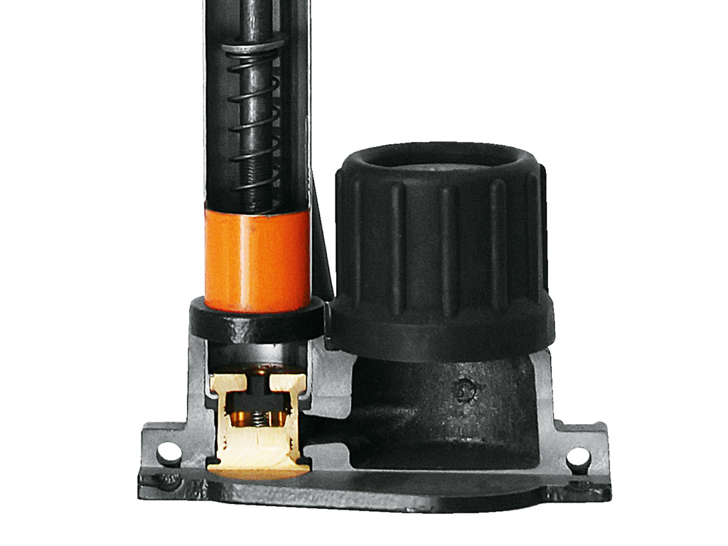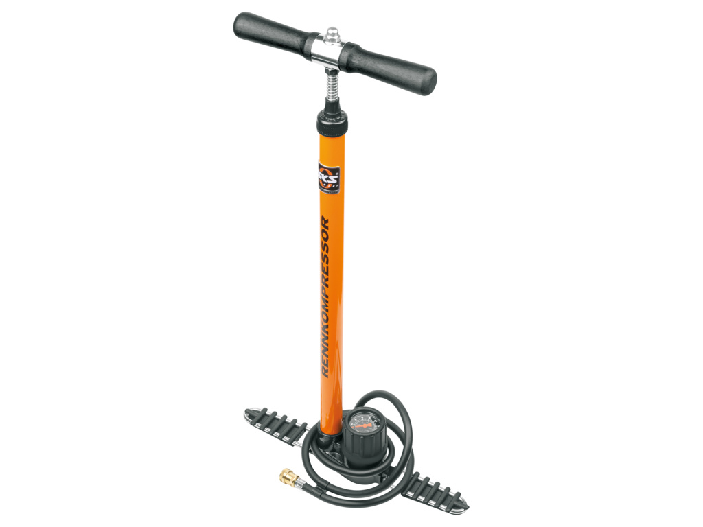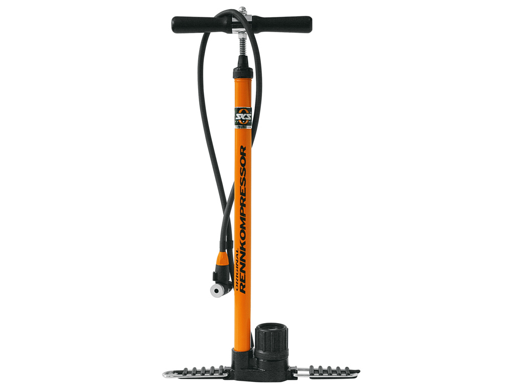 SKS Rennkompresor je špičková nožná pumpa, ktorá zvládne tlak až 16 barov. Oceľové telo, veľké madlo, sklapovacie podložky pod nohy. Vysokotlaková hadica s rôznymi koncovkami (AVACS, páková koncovka s adaptérom alebo Multi Valve koncovka).