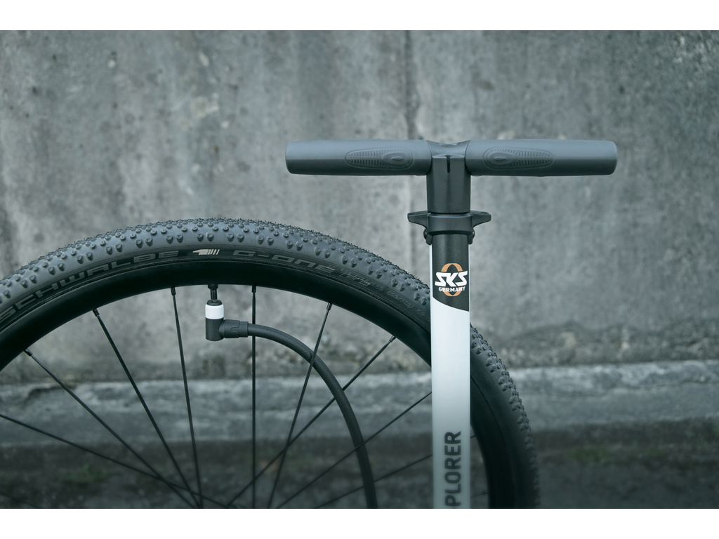 Pumpa SKS AIR-X-PLORER je navrhnutá pre jednoduché a efektívne hustenie plášťov. Jednou z jej hlavných predností je kompatibilita s ventilmi Schwalbe Clik Valve vďaka technológii CLIK TEC, ktorá umožňuje jednoduchú konverziu na tento nový ventilový systém.