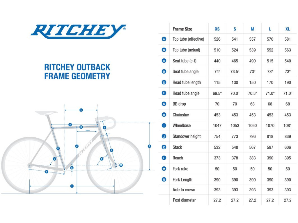 Outback je starostlivo zvarený metódou TIG s patentovanými trikrát skrátenými oceľovými trubkami Ritchey Logic, ktoré teraz majú aktualizovanú jednodielnu konštrukciu priehradovej konštrukcie pre brzdy s plochým uchytením (poskytujú rovnakú tuhosť a pevnosť ako predchádzajúce uchytenie a zároveň výrazne znižujú hmotnosť).