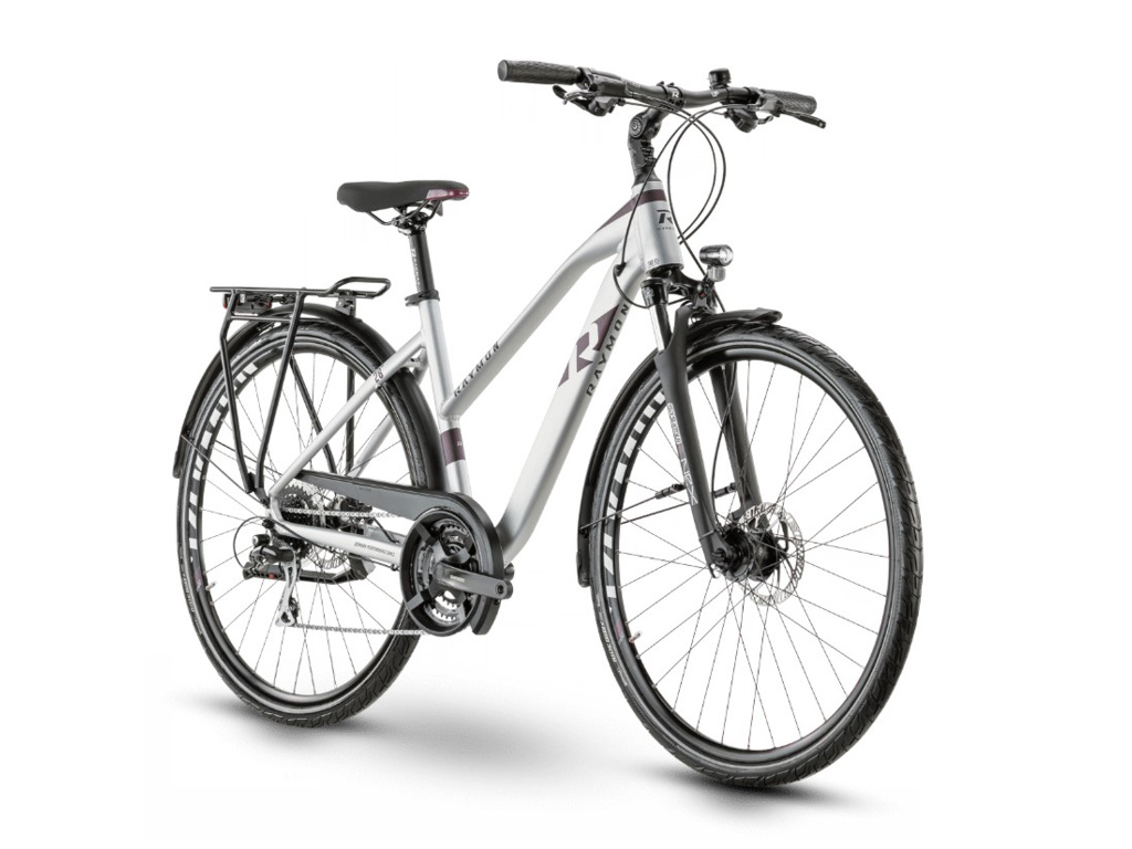 RAYMON TourRay 3.0 Lady je dámské trekingové kolo se sníženou horní rámovou trubkou pro pohodlný výstup a nástup vhodné do každodenního provozu. Hodí se na jízdu do práce, ale nezalekne se ani víkendových vyjížděk po cyklostezkách a lesních cestách. Díky odpružené vidlici SR Suntour se popere s nerovnostmi terénu a zajistí vám pohodlí. Je vybaveno řazením SHIMANO s 3x7 převody a spolehlivými brzdami TEKTRO HD, které se postarají o vaše bezpečí. Řada praktických doplňků jako jsou blatníky, zadní nosič, osvětlení poháněné dynamem, stojanem a kryt řetězu zjednoduší vaši cestu ve městě.