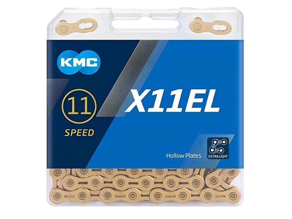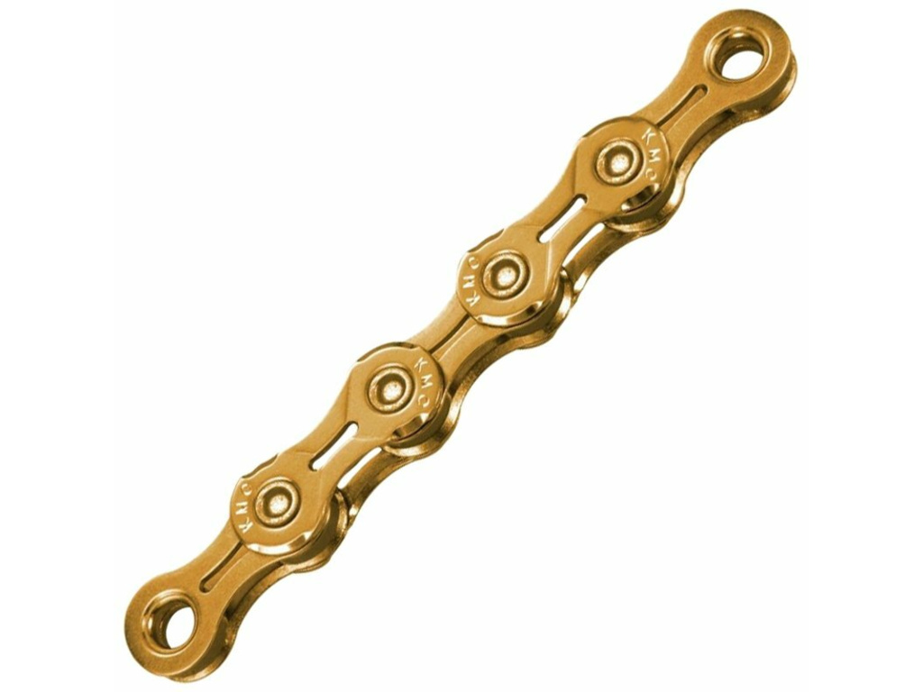 Superlehký 11rychlostní řetěz KMC X11EL Ti-N s povrchovou úpravou ve zlaté barvě, kompatibilní s řazením Shimano, Sram i Campagnolo.