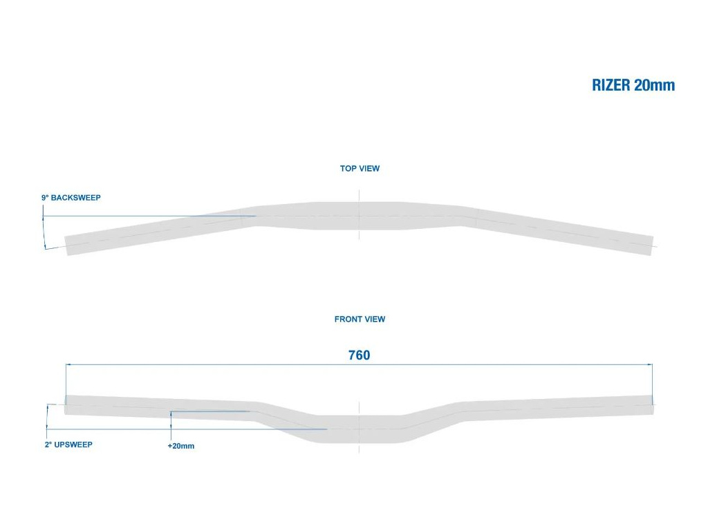 MTB riadidlá šírky 760 mm, materiál triple-butted 7050 alloy, 9 st. backsweep, 2 st. upsweep, Blatte Black finiš, rise 20 mm, priemer riadidiel 31,8 mm, hmotnosť 242 g.