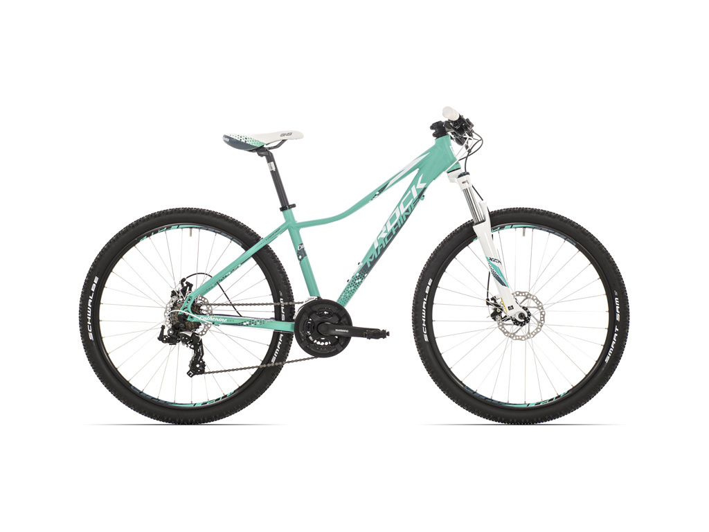 Dámsky horský bicykel Rock Machine Catherine 60 s hliníkovým rámom v štýlových farbách a 27,5-palcovými kolesami. Ideálny bicykel pre rekreačných cyklistov. Je vybavený odpruženou vidlicou Suntour XCT, mechanickými kotúčovými brzdami a komponentmi Shimano s 21 prevodmi.