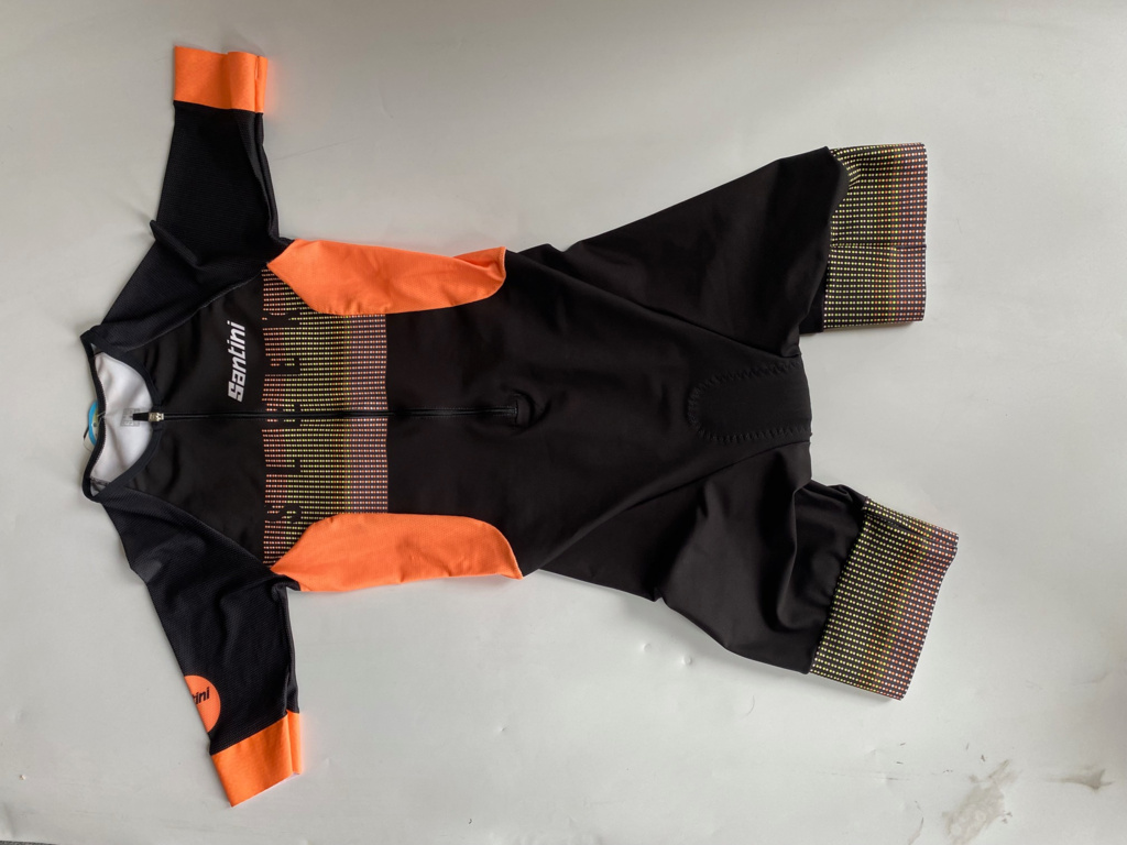 SANTINI Sleek custom Triathlon je triatlonová kombinéza aero strihu navrhnutá pre maximálne aerodynamické vlastnosti a efektivitu. Tento úzky strih je v prednej časti kratší a v zadnej časti predĺžený, špeciálne vyvinutý s ohľadom na jazdnú polohu na zvýšenie efektivity. Pokiaľ preferujete menej tesný strih, je doporučené zvoliť si o veľkosť väčší model. Kombinéza je vyrobená z rýchloschnúcej látky, má štandardný zadný zips ITU s uzamykacím systémom, nohavičky Silimo, triatlonovú vložku GTR a je dostupná aj s vreckami na chrbte.