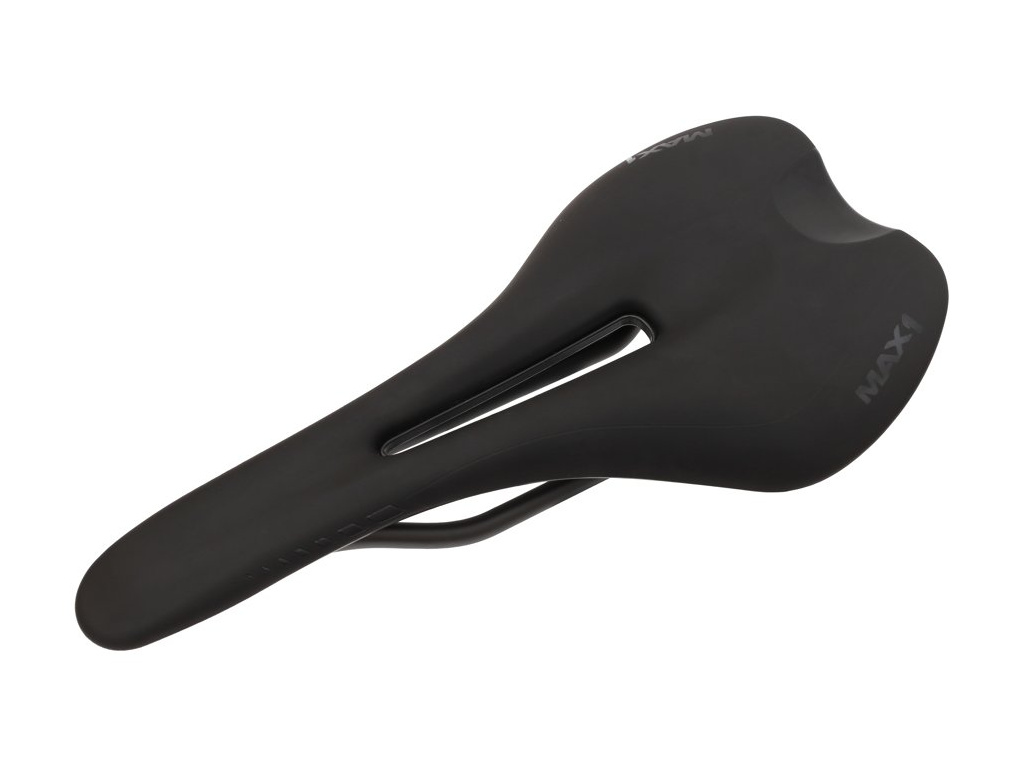 Závodné sedlo MAX1 Evo s karbnovými lyžinami, karbónovou platformou a ergonomickým otvorom v strednej časti.