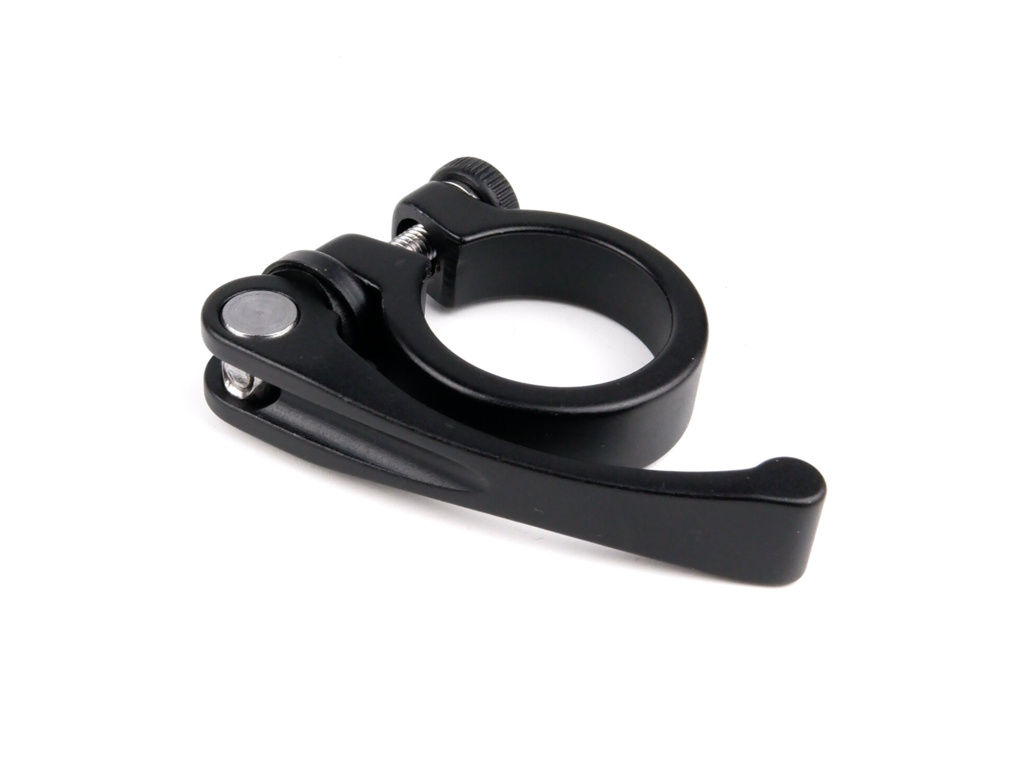 Hliníková sedlová objímka s rýchloupínaním v matnej čiernej farbe.