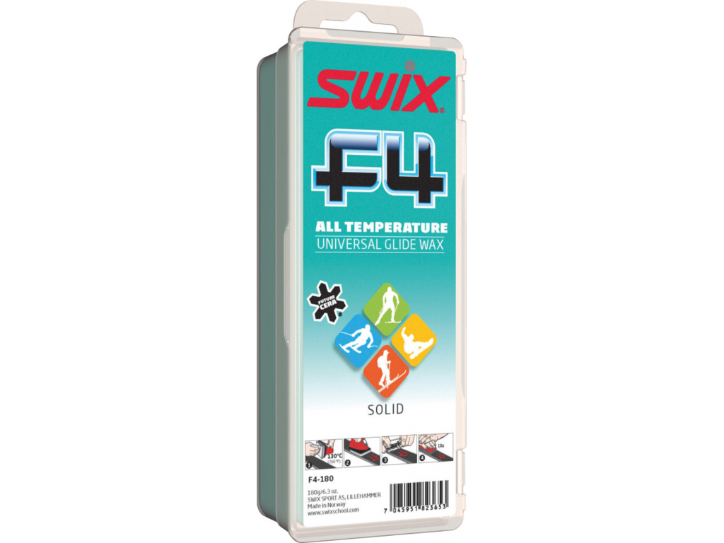 Skluzný vosk F4 Universal All Temperature Solid wax je určen lyžařům i snowboardistům. Lze jej použit při všech sněhových podmínkách. Zažehluje se. Doporučení: Zažehlete žehličkou, po vychladnutí strhněte škrabkou a vykartáčujte ocelovým kartáčem nebo kombikartáčem.