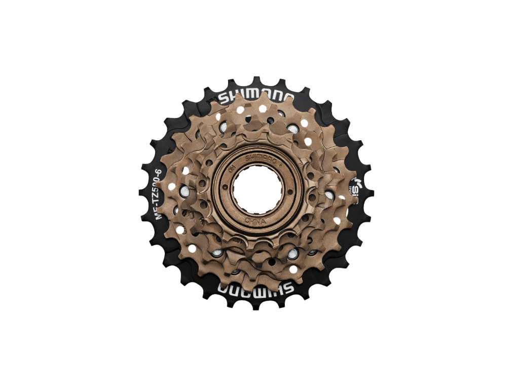Šesťrýchlostný skrutkový reťazový prevodník Shimano TZ50, používaný na starších a lacnejších modeloch bicyklov.