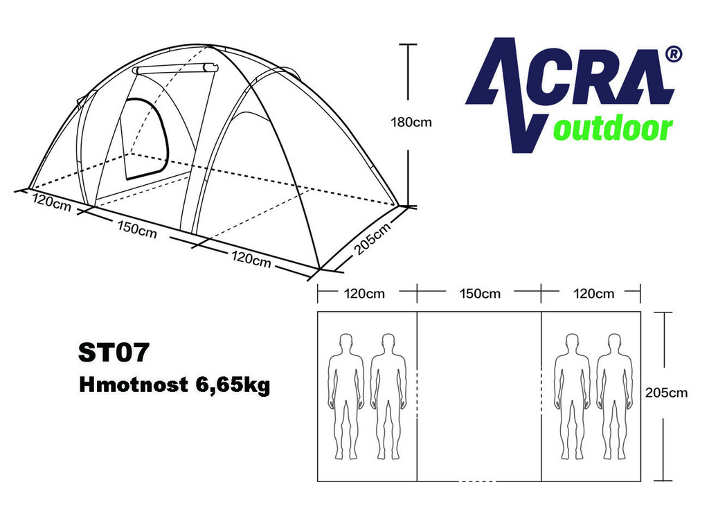 Rodinný stan ARCA Brother ST07 pre 4 osoby v dvojplášťovej konštrukcii. Stan je vybavený dvoma spálňami a predsieňou, kde si môžete umiestniť batožinu alebo iné kempingové vybavenie. Obe spálne sú vybavené moskytiérou a vetraním so sieťkou v hornej časti spálne, ktoré zabezpečuje optimálne vetranie bez vniknutia nežiaduceho hmyzu do spálne. Podlaha je vyrobená z PE materiálu s odolnosťou proti vode a vodným stĺpcom 3000 mm. Plášť je vyrobený z polyesteru s vodným stĺpcom 2000 mm. Plášť je impregnovaný a má podlepené švy, takže je nepremokavý. Veľký rodinný stan vhodný na príležitostné kempovanie s predsieňou a slnečným prístreškom, ktoré spolu vytvárajú dostatok vnútorného priestoru aj v nepriaznivom počasí. Aj napriek svojej veľkosti je veľmi skladný a pomocou laminátových tyčí jeho postavenie netrvá dlhšie ako 15 minút. Rozmery: šírka dvoch spální: 120 cm šírka chodby: 140 cm