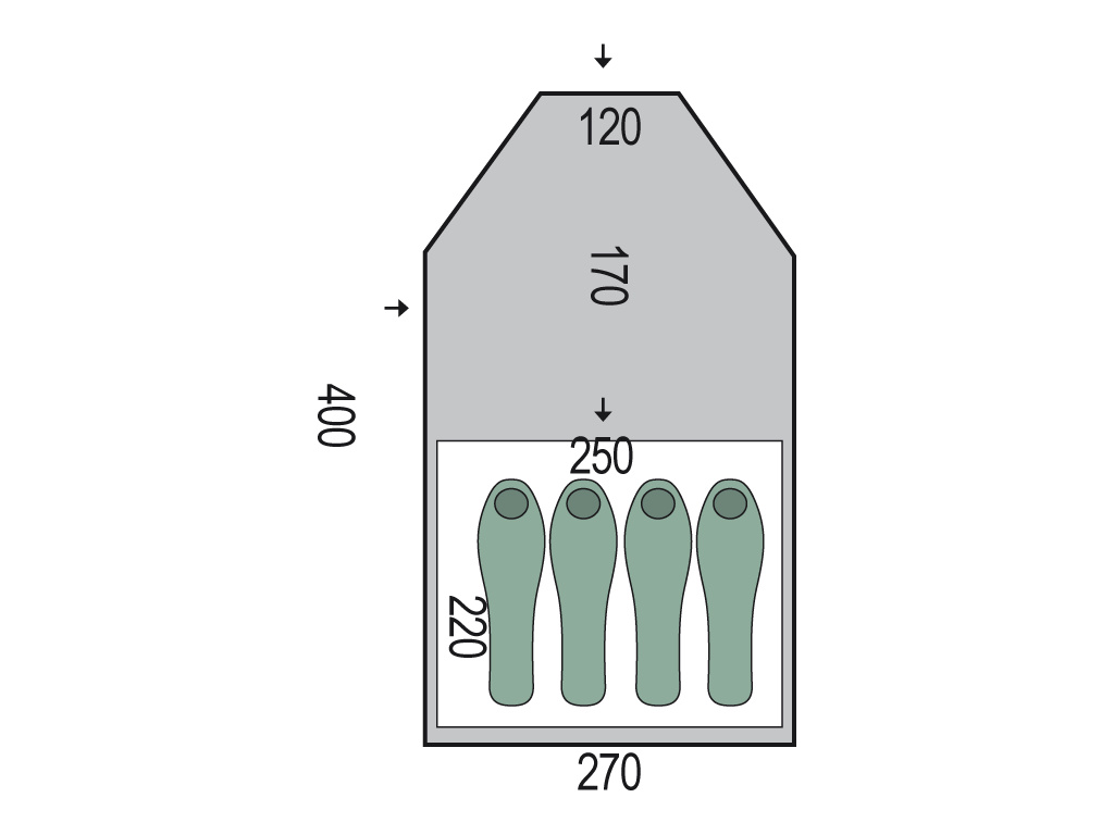 Priestranný stan pre štyri osoby s veľkým množstvom vchodov a veľkou predsieňou, ktorý si zachováva výhodu malých stanov - jednoduchú a rýchlu stavbu.