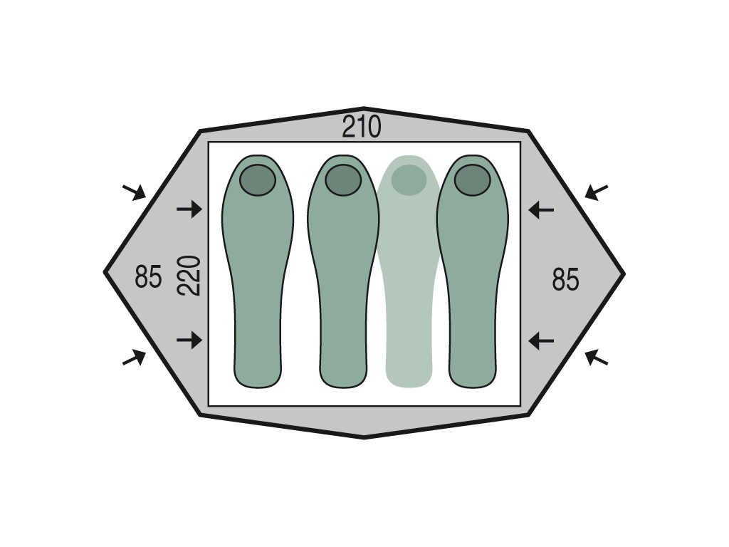 Osvedčený model s dvoma vchodmi a predsieňami s osvedčenou konštrukciou priečneho horného nosníka. Poskytuje dostatok priestoru a pohodlie súkromného vchodu pre spiace osoby na oboch stranách spálne. Vďaka tuhosti konštrukcie je stan vhodný na použit
