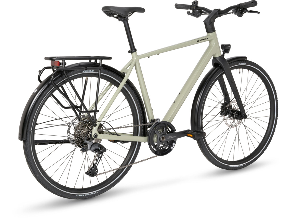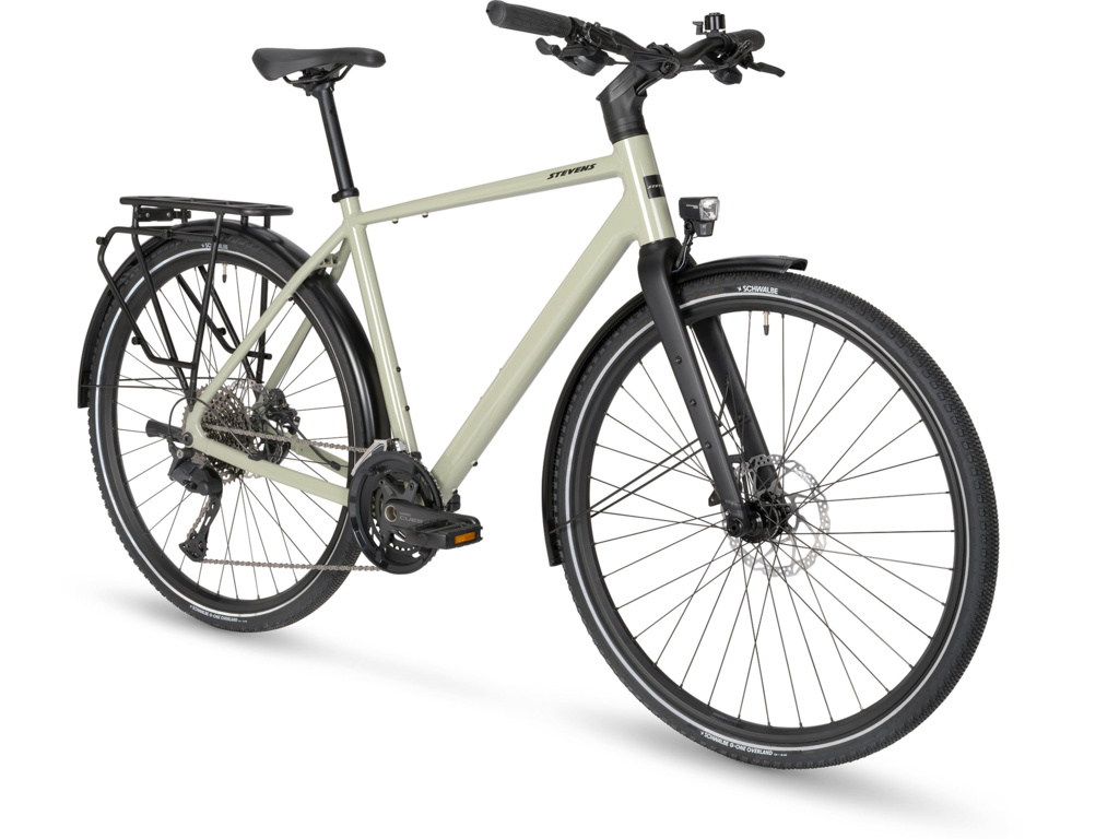 STEVENS Caleta 8.1 je všestranný trekingový bicykel určený pre tých, ktorí hľadajú maximálnu kvalitu a spoľahlivosť na každej ceste. Hliníkový rám v kombinácii s ľahkou vidlicou STEVENS S-Lite zabezpečuje pevnosť a stabilitu. Pohon Shimano CUES U6000 s 2x11 prevodmi a širokým rozsahom 11–45 zubov zvládne mestskú prevádzku aj náročnejšie trasy. Brzdy Shimano Deore BR-MT410 s kotúčmi 180 mm poskytujú bezpečné a plynulé zastavenie. Bicykel je vybavený výkonným LED svetlom Trelock a zadným svetlom B+M Xeltec napájanými z nábojového dynama. Plášte Schwalbe G-One Overland šírky 45 mm dodávajú jazde pohodlie a istotu aj na nerovnom povrchu.