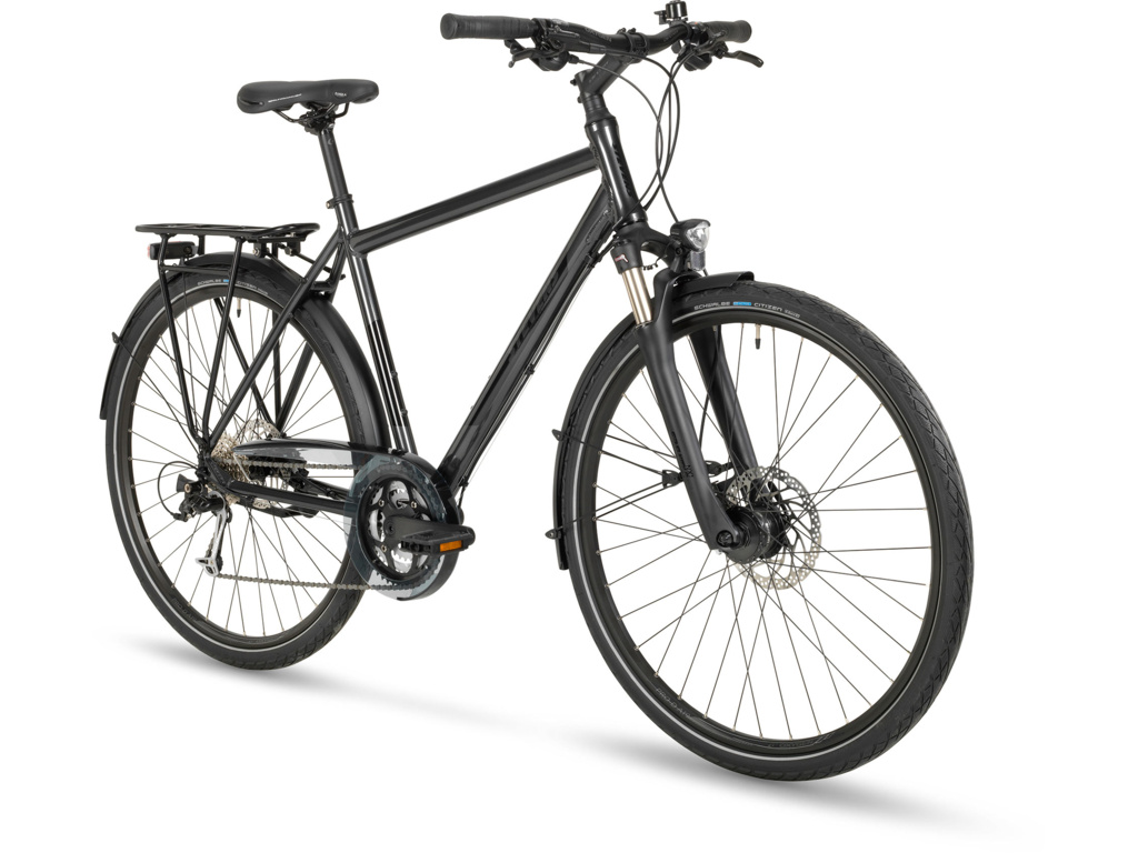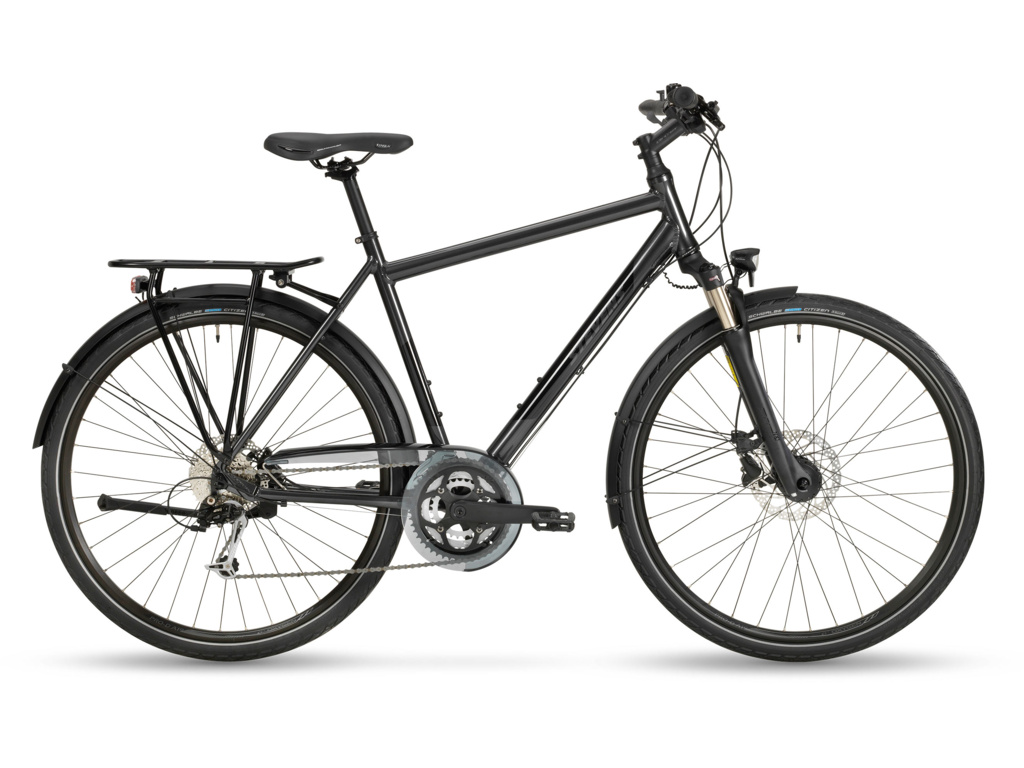 Trekingové kolo vhodné pro každodenní dojíždění i víkendové výlety s vysokou mírou pohodlí. Nabízí odpruženou vidlici se světlem, spolehlivé kotoučové brzdy Shimano a 3x9 převody Sunrace.