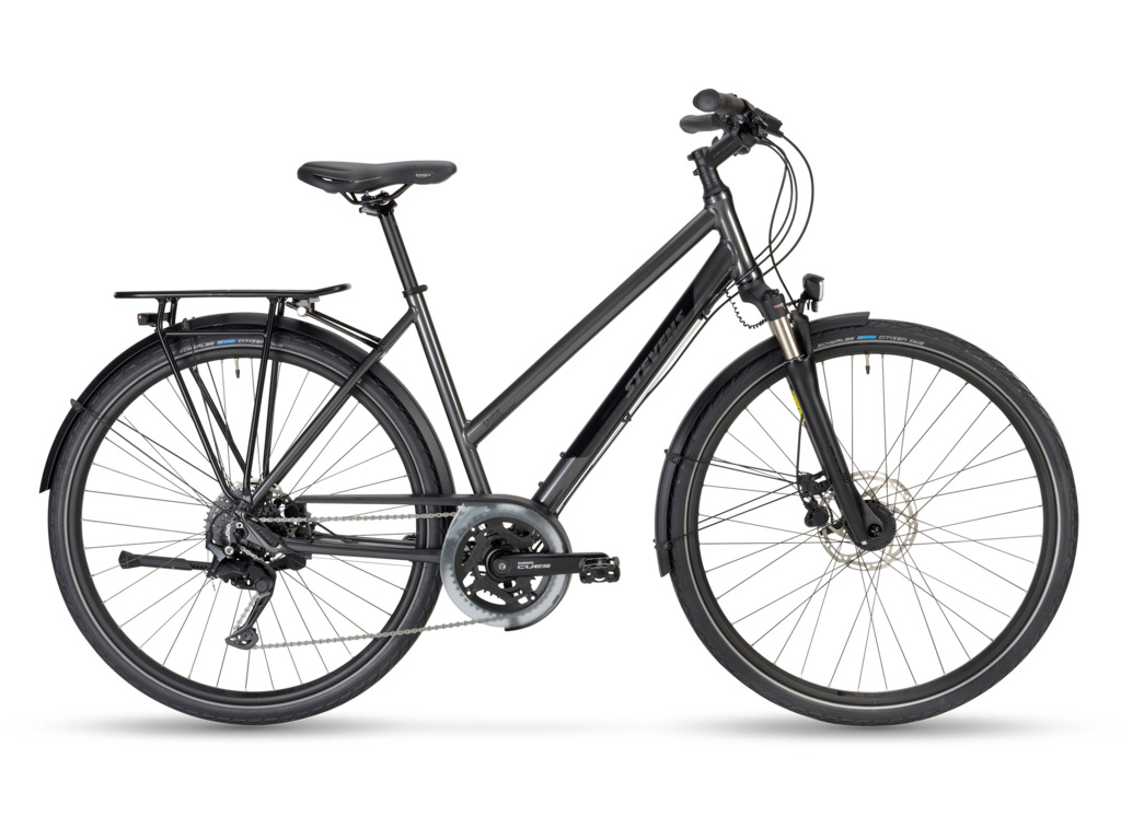 STEVENS Savoie je ideální volbou pro každodenní použití i víkendové výlety. Na první pohled zaujme elegantním designem, který podtrhuje lesklý šedý lak. Pohodlí zajišťuje odpružená vidlice SR Suntour s možností zamykání a ergonomicky laděný kokpit. Řazení Shimano CUES U4000 v kombinaci s přesmykačem U6000 přináší plynulý chod a široký rozsah 2×9 převodů. Bezpečnost na cestách zajišťují hydraulické kotoučové brzdy Tektro, a o bezstarostnou jízdu za každého počasí se postará kompletní výbava včetně blatníků, světel a nosiče. Savoie je dostupný ve třech rámech: pánském, dámském i nízkém nástupu (Forma).