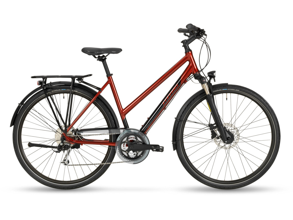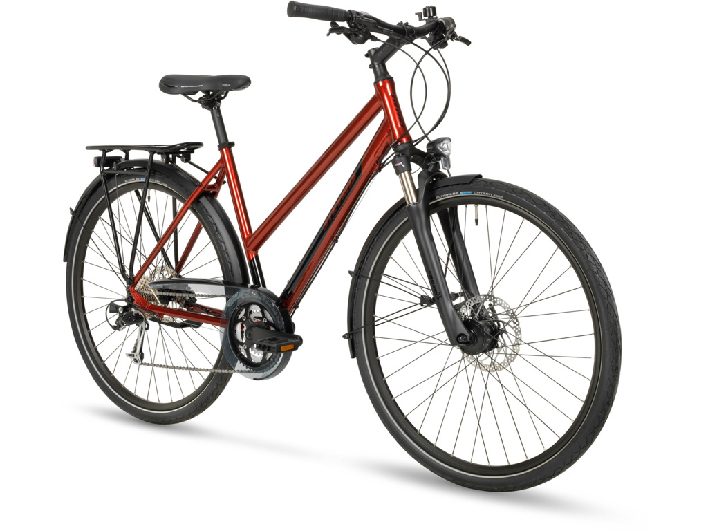 Trekingové kolo vhodné pro každodenní dojíždění i víkendové výlety s vysokou mírou pohodlí. Nabízí odpruženou vidlici se světlem, spolehlivé kotoučové brzdy Shimano a 3x9 převody Sunrace.