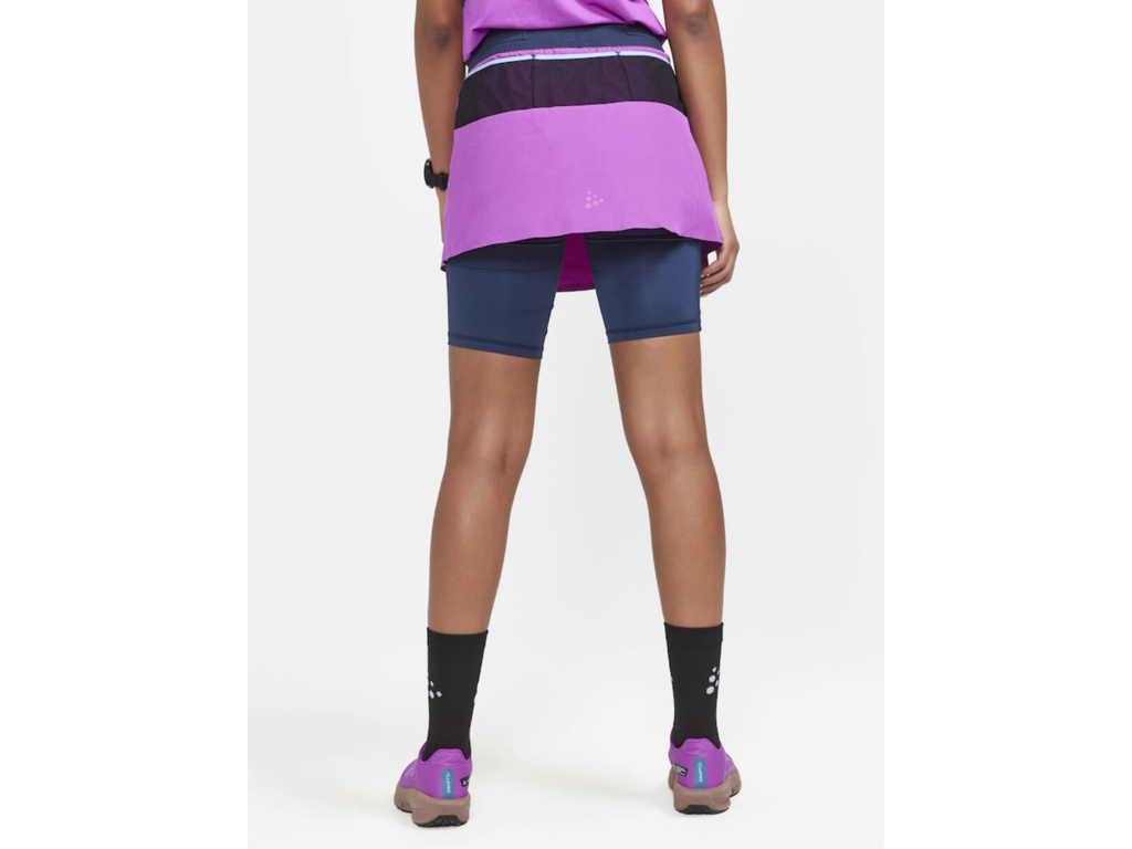 CRAFT Pro Train 2in1 je dámská technicky vysoce propracovaná sukně určená primárně pro trailový běh. Svrchní část je strečová, šitá do čtyř stran. V pase má širokou gumu s poutky pro gely a meshové kapsy na bedrech. V pase je také stahování na šňůrku, aby se vám model dokonale přizpůsobil. Vnitřní kasička pojme vaše nezbytné maličkosti a díky recyklovanému materiálu navíc šetříte životní prostředí.