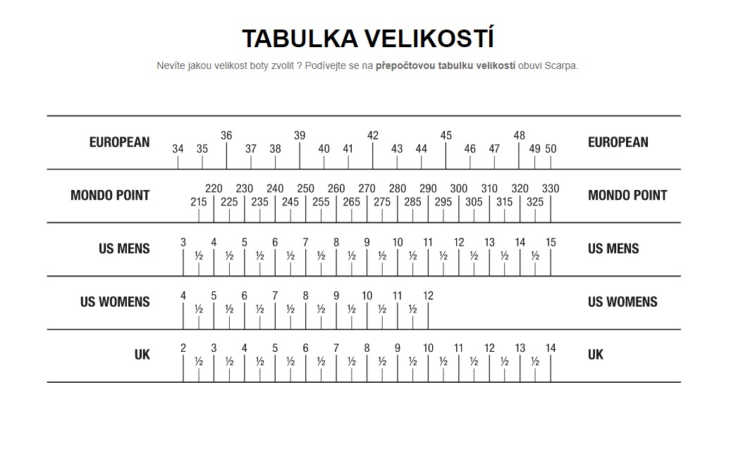 DÔLEŽITÉ: Na e-shope uvádzame u skialpových topánok SCARPA veľkosť MONDO POINT v centimetroch. V tabuľke nižšie je MONDO POINT vyjadrený v milimetroch. MONDO POINT je dĺžka chodidla od päty k najdlhšiemu prstu (palec u niekoho ukazovák).