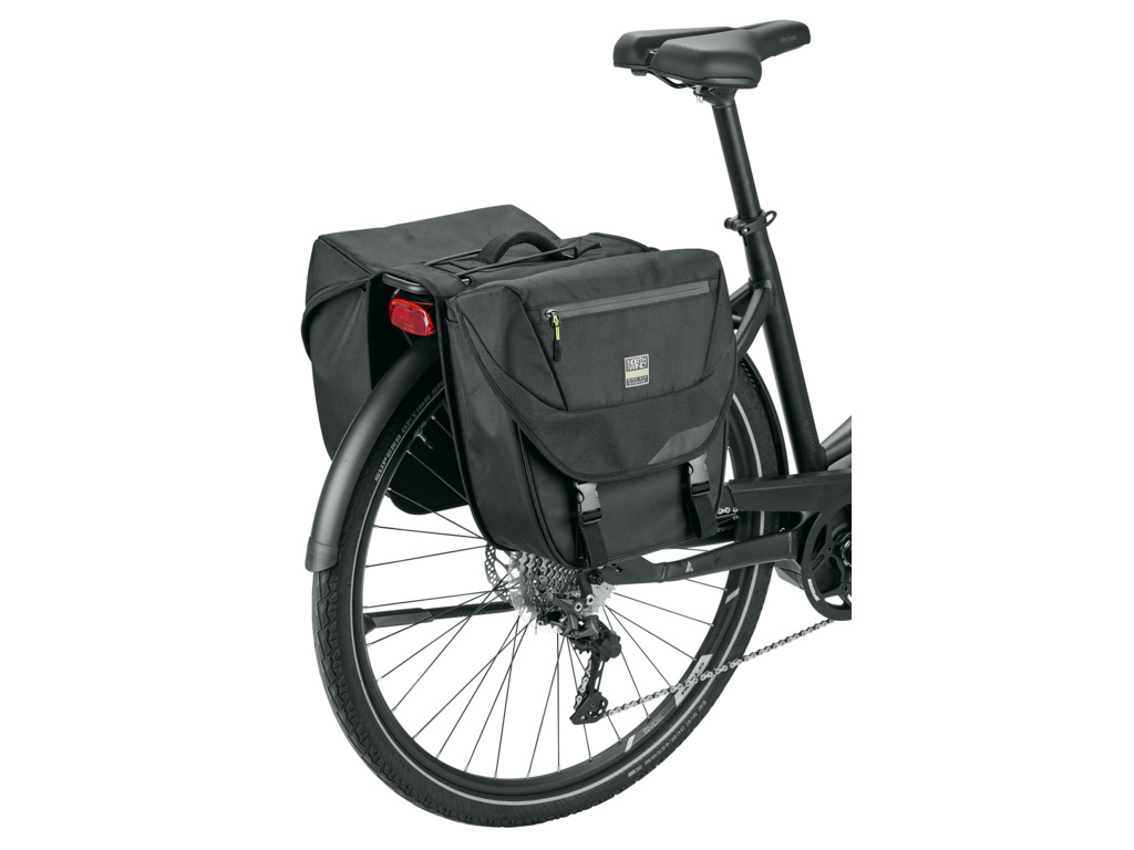 Taška pasuje na všetky nosiče batožiny s pružinovou klapkou – stačí klapku otvoriť, nasadiť tašku a znovu ju zatvoriť. Dodatočné zaistenie suchým zipsom drží tašku pevne na mieste. Model PANNIER CLASSIC DOUBLE BAG je v prednej časti mierne zaoblený, aby neprekážal pri pedálovaní. Polstrovaná rukoväť uľahčuje prenášanie mimo bicykla.