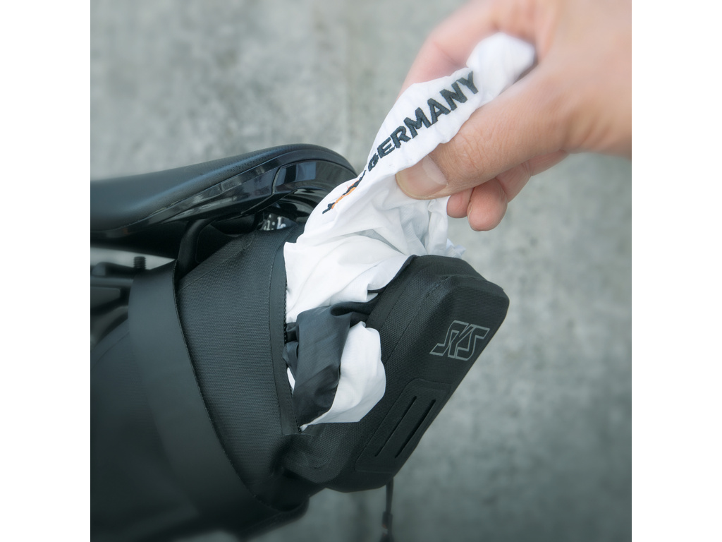 Dve vnútorné sieťované vrecká bezpečne uschovajú kľúče alebo peniaze. Tašku SKS možno ľahko upevniť pod sedlo bicykla pomocou protišmykových suchých zipsov, ktoré sa dajú individuálne skrátiť a vymeniť. Na zadnej strane tašky je držiak na zadné svetlo a reflexné logo SKS, ktoré zvyšuje viditeľnosť za šera.