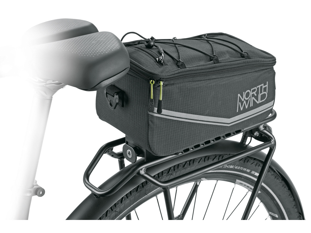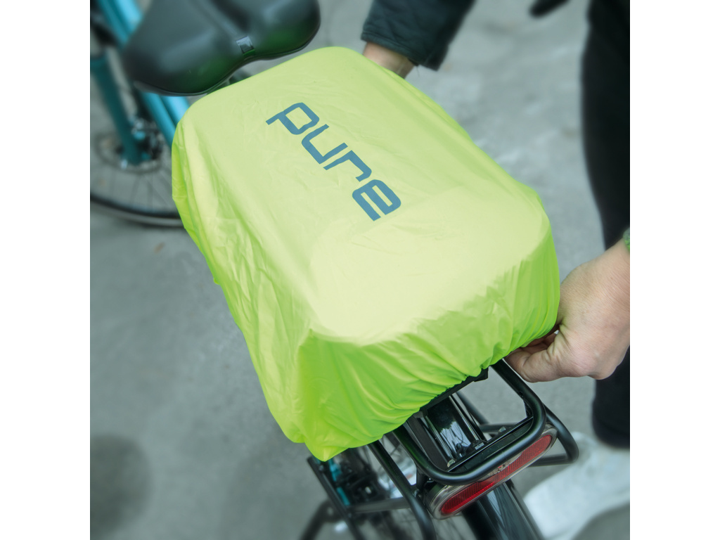 Taška s priestrannou hlavnou priehradkou. Úložné vrecko z elastickej sieťoviny umožňuje prevážať ďalšiu batožinu. Pláštenka udrží tašku aj jej obsah v suchu, zatiaľ čo reflexné prvky na vodoodpudivej nylonovej tkanine zabezpečujú viditeľnosť aj v tme.
